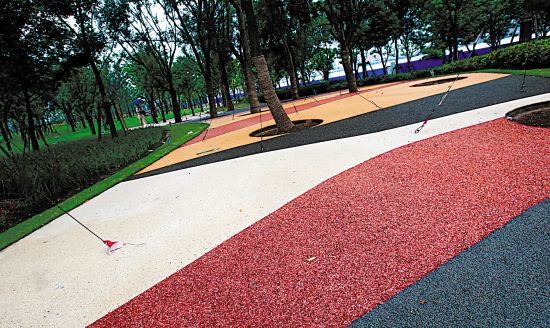 彩色透水沥青路面是一种新型的环保沥青路面, 它拥有约20%孔隙,下雨时能够快速补充城市地下水资源,并能吸收车辆行驶产生噪音,能减少地面阳光反射热能,降低地面温度,减少“热岛效应”。彩色透水沥青路面还能提供过滤效果,避免汽车及工业排放重金属,轮胎磨损及工业粉尘等直接流入河流中。整体性高承载透水艺术沥青路面铺装系统, 其抗沉降性能强于一般透水砖沥青路面. 经国家检测机关鉴定, 整体性高承载透水艺术沥青路面能够达到C25以上混凝土的承载标准,整体承载力显著优于一般透水砖的承载能力。同时,这种铺装系统也具有抵抗土壤冻胀对刚性路面产生破坏的能力。三、直涂式型彩色防滑路面