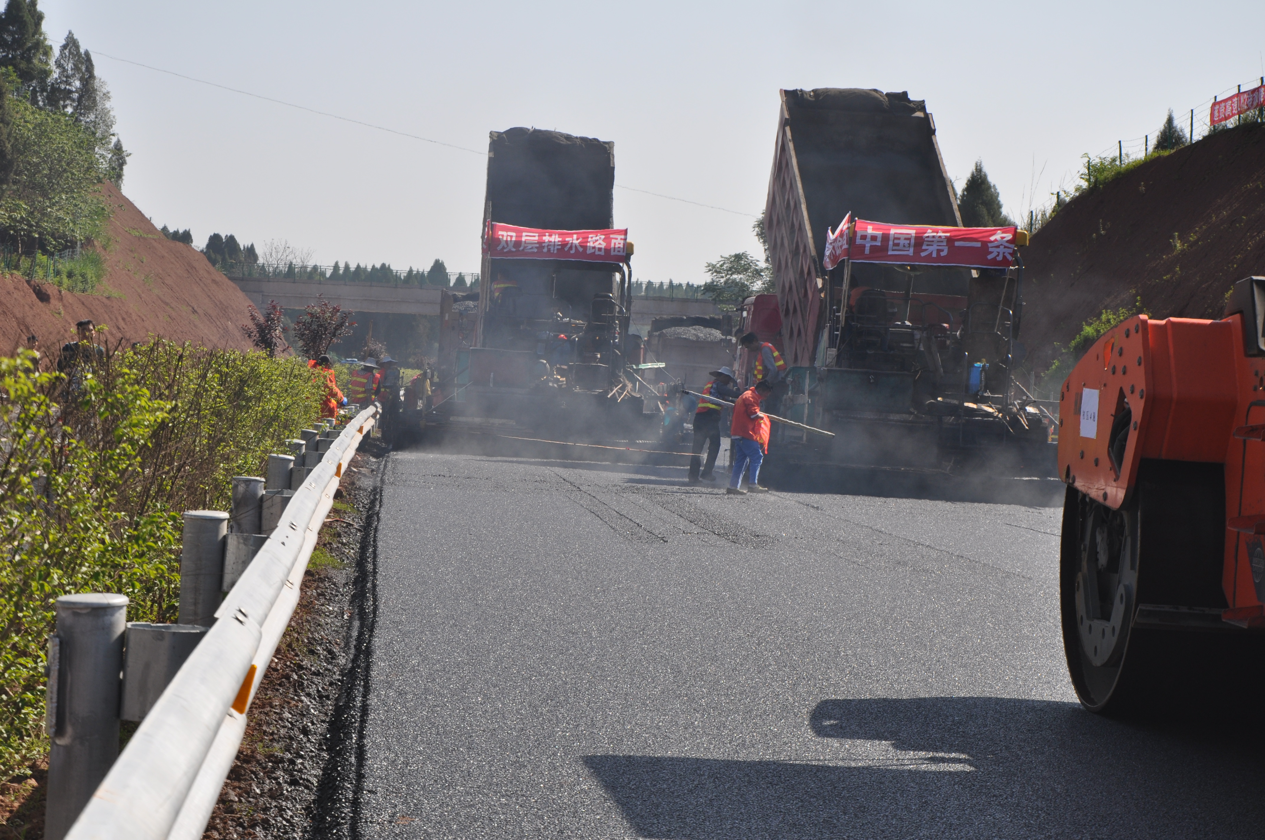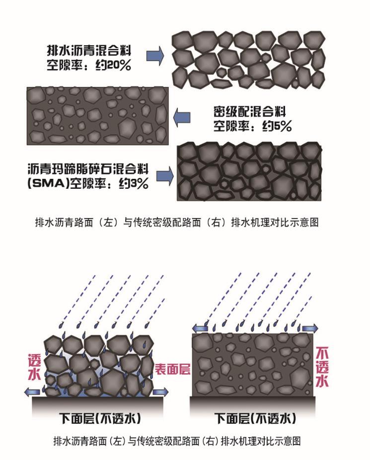 排水沥青降噪路面采用大空隙沥青混合料作表层,将降雨透入到排水功能层,并通过层内将雨水横向排出,从而消除了带来诸多行车不利作用的路表水膜,显著提高雨天行车的安全性、舒适性;同时,由于排水沥青降噪路面的多孔特征可以大幅降低交通噪音,也被称为低噪音沥青路面。
